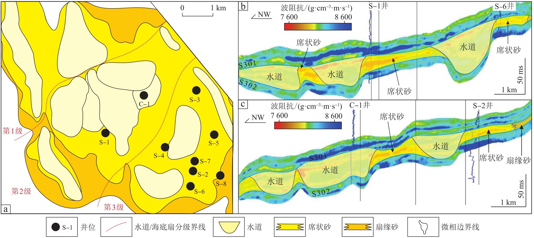 | 图6 东方1-1气田黄一段海底扇沉积特征 a. 沉积相平面展布特征;b. 剖面1沉积相;c. 剖面2沉积相(图6b, c剖面位置见图1b。) |