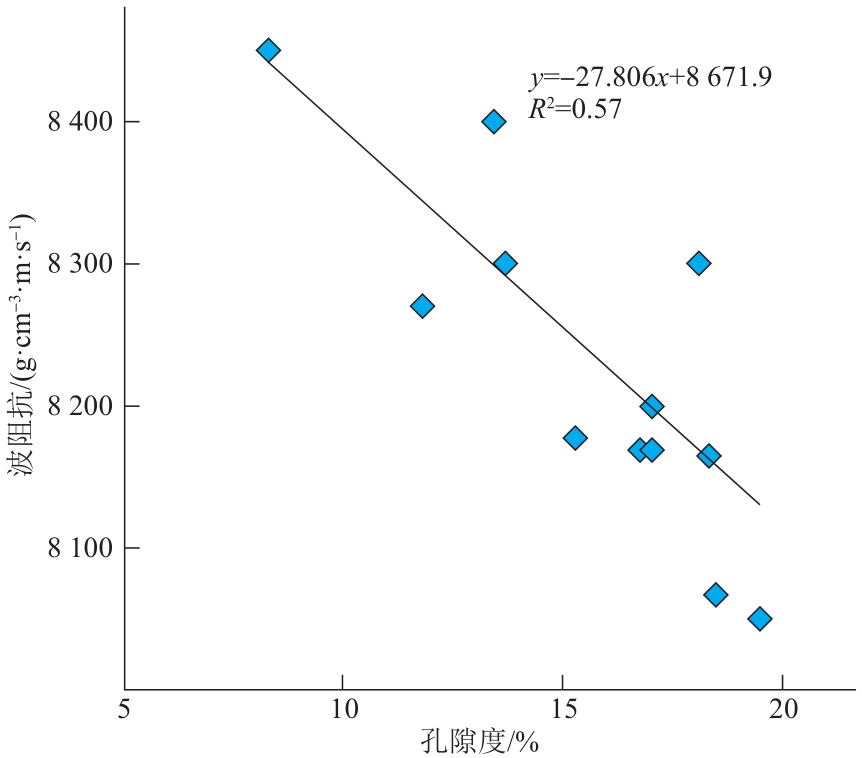 | Fig.8 Relationship between seismic wave impedance and porosity of the 1st member of the Huangliu Formation in the Dongfang 1-1 gas field |